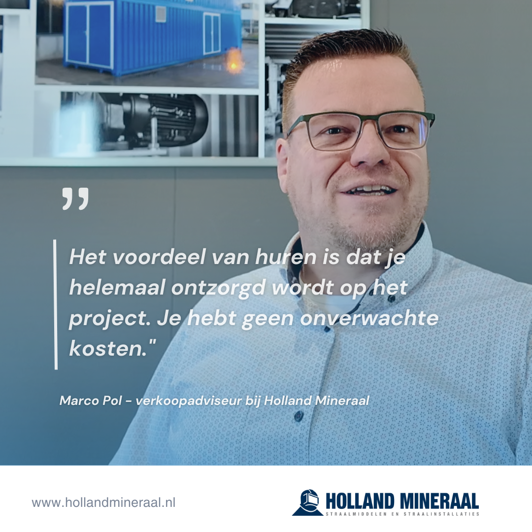 Holland Mineraal verhuurt het complete pakket: straalketels, afzuiginstallaties, afzetsilo's en straalmiddel recycling units. Je wordt volledig ontzorgd op het project.